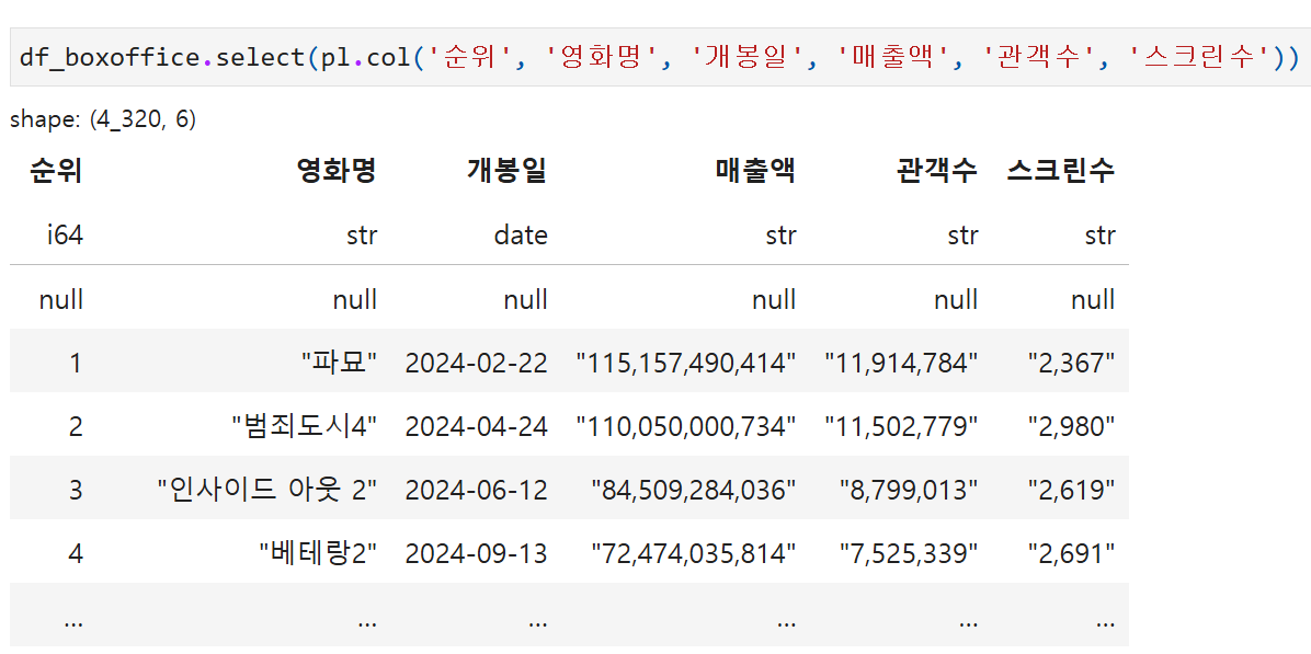 다음은 폴라스를 사용한 2024 박스오피스 1~4위의 매출액, 관객수, 스크린수 데이터 분석 결과입니다.